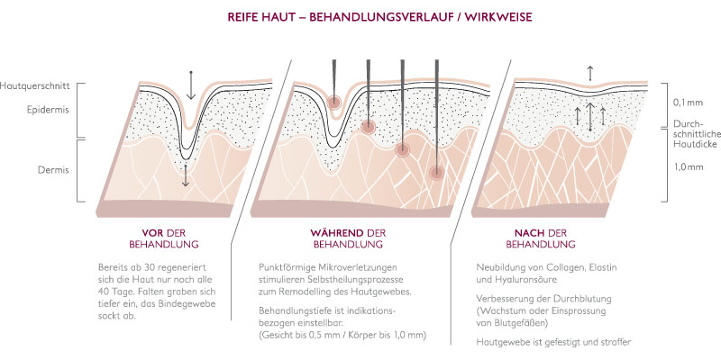 Microneedling nutzt die Selbstheilungskräfte der Haut. Punktgenau perforieren Mikrofeine Nadeln die Haut und setzen gezielt Mikroverletzungen in der Epidermis, die dieser „Wundheilung“ signalisieren. Das „müde“ Gewebe wird daraufhin sofort aktiv und setzt Prozesse in Gang, die zur Collagen- und Elastinneubildung und Hyaluronsäuse-Aktivierung führen.